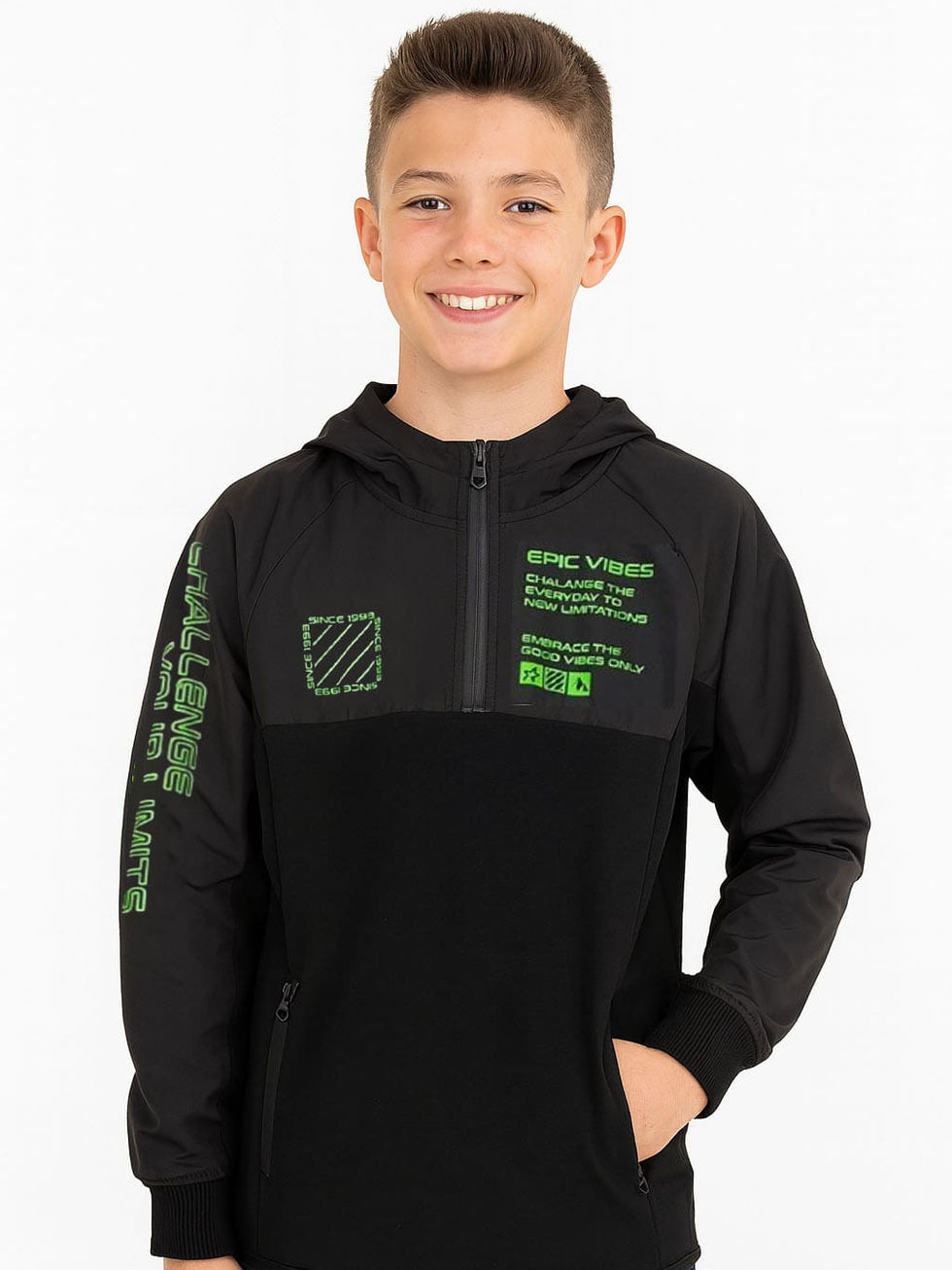 Duks koji kombinuje udobnost i moderan dizajn sa zanimljivim detaljima i kontrastima. Gornji deo sa rajsferšlusom olakšava oblačenje, dok kapuljača i bočni džepovi dodaju praktičnost za svaki dan. Istaknuti print motivi unose dozu energije i mladalačkog stava. Savršen je za školu, igru napolju ili sportske aktivnosti.