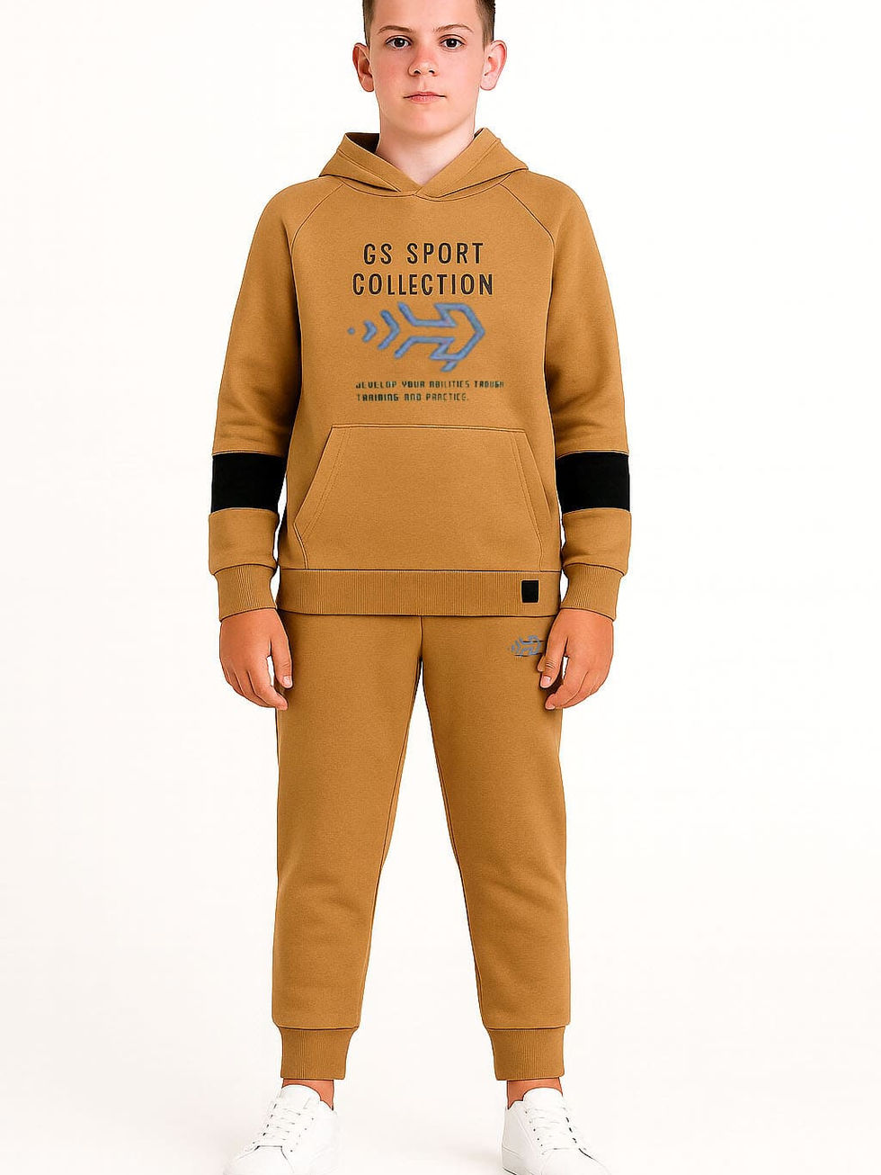 Udobna, moderna i spremna za sve dečačke izazove! Gornji deo dolazi sa kapuljačom i upečatljivim printom „GS Sport Collection“, dok su crni detalji na rukavima tu da dodaju sportski karakter. Donji deo trenerke prati isti ton, sa elastičnim pojasom i ranflama za udobno nošenje tokom celog dana. Savršen izbor za školu, trening ili igru.