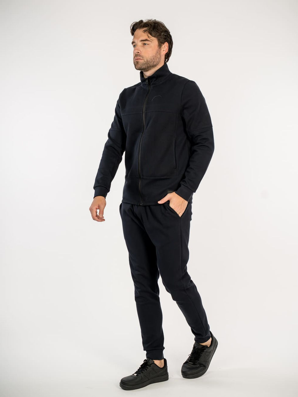 Trenerka sa zip jaknom visokog okovratnika i donjim delom jogger kroja, kreirana za svakodnevni ritam. Crna osnova sa diskretnim detaljima pruža sveden, ali moderan izgled, dok elastični materijali omogućavaju slobodu pokreta. Idealna za trening, šetnju ili ležerne gradske kombinacije.