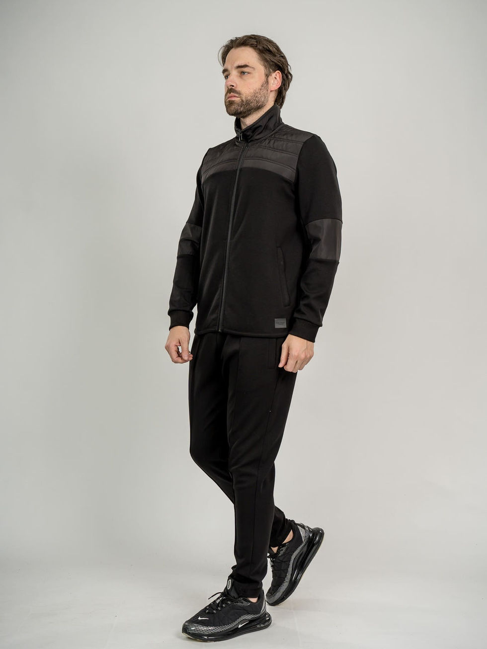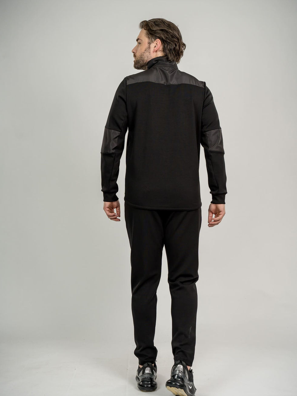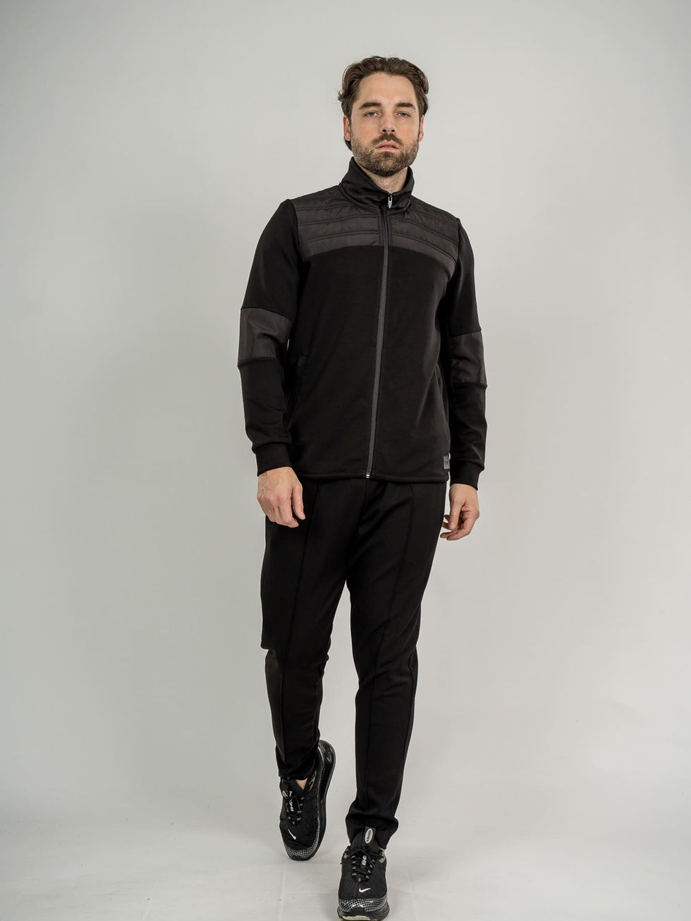 Muška komplet trenerka u tamnoj paleti, sa diskretnim panelima koji dodaju vizuelnu dinamiku bez narušavanja jednostavnosti. Zip jakna i donji deo sa sportskim krojem pružaju udobnost i slobodu pokreta, idealno za trening, šetnju ili opuštene dnevne kombinacije.