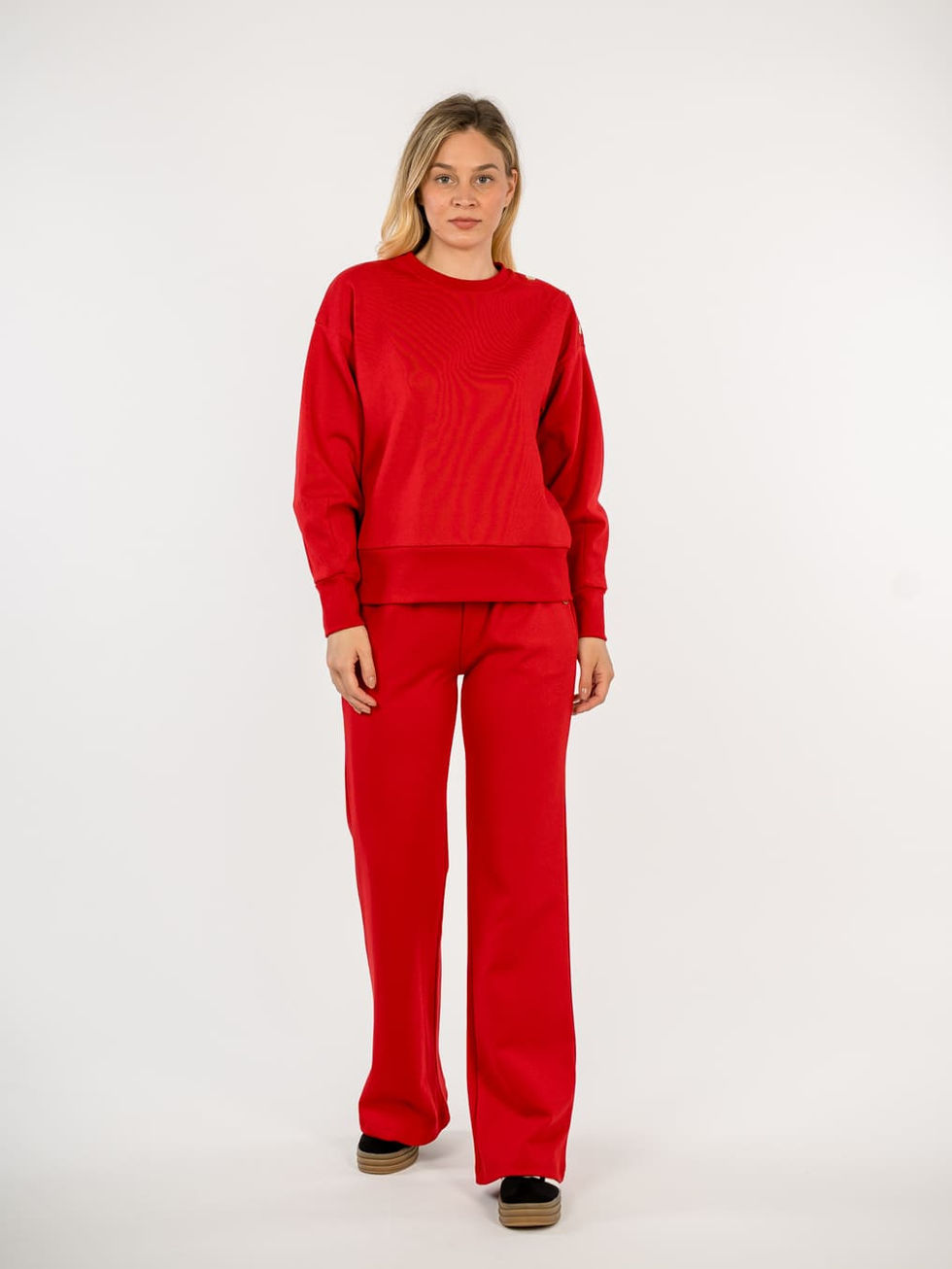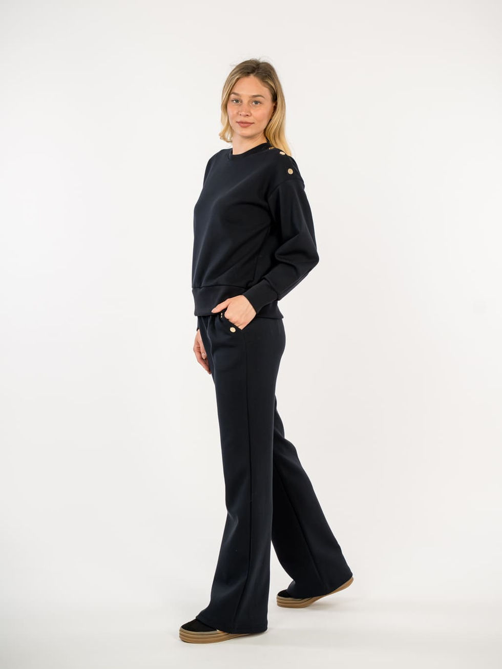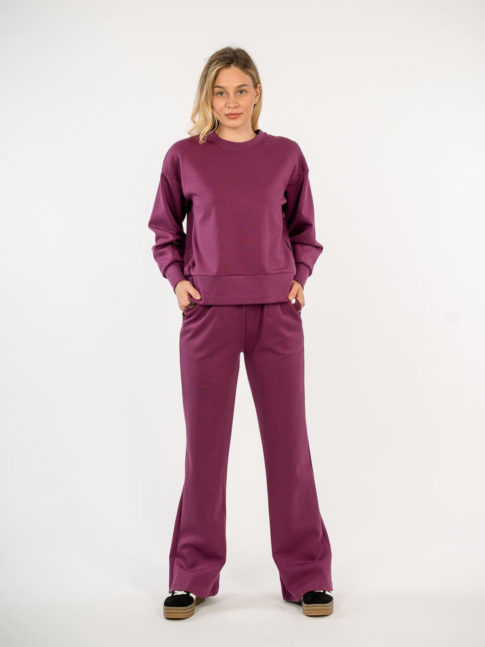 Duks sa spuštenim ramenima i širokim pojasom pruža osećaj slobode i topline, dok ravne pantalone sa višim strukom vizuelno izdužuju figuru i lepo prate liniju tela. Napravljen od mekog, prijatnog materijala, komplet je idealan za dane kada želiš da se osećaš i izgledaš sjajno – bilo kod kuće, u šetnji ili na kafi sa prijateljicama. Možeš ga nositi kao set, ali se gornji i donji deo lako kombinuju i sa drugim komadima iz garderobera.