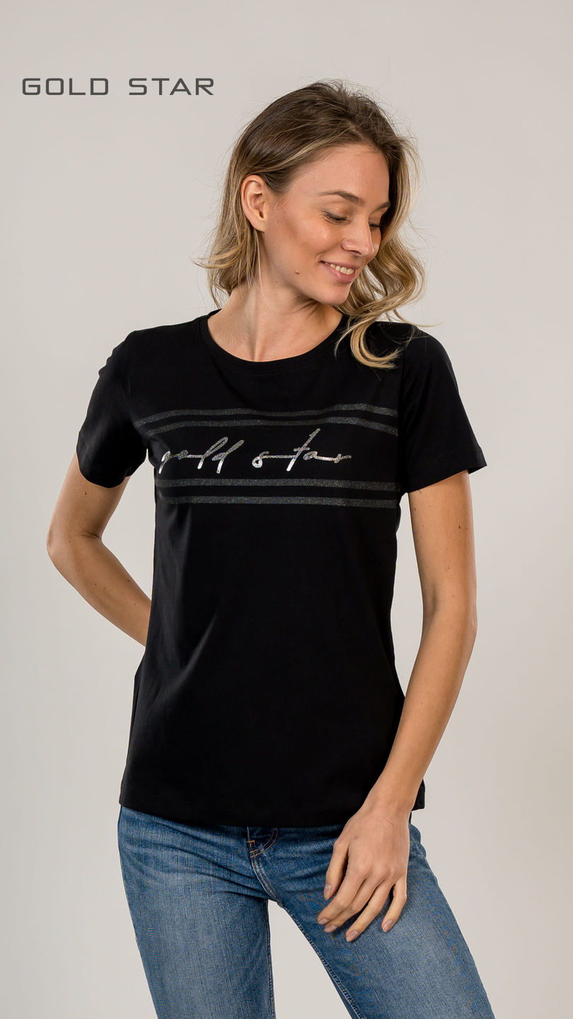 Majica koja govori stilom – jednostavno, ali efektno. Print sa logom „Gold Star” uokviren dvostrukim linijama daje ovoj majici poseban karakter. Prijatna na dodir, savršena za svaki dan, bilo da je nosiš uz farmerke, šorts ili trenerku. Za one dane kada ti treba lakoća oblačenja, ali i doza samouverenosti.