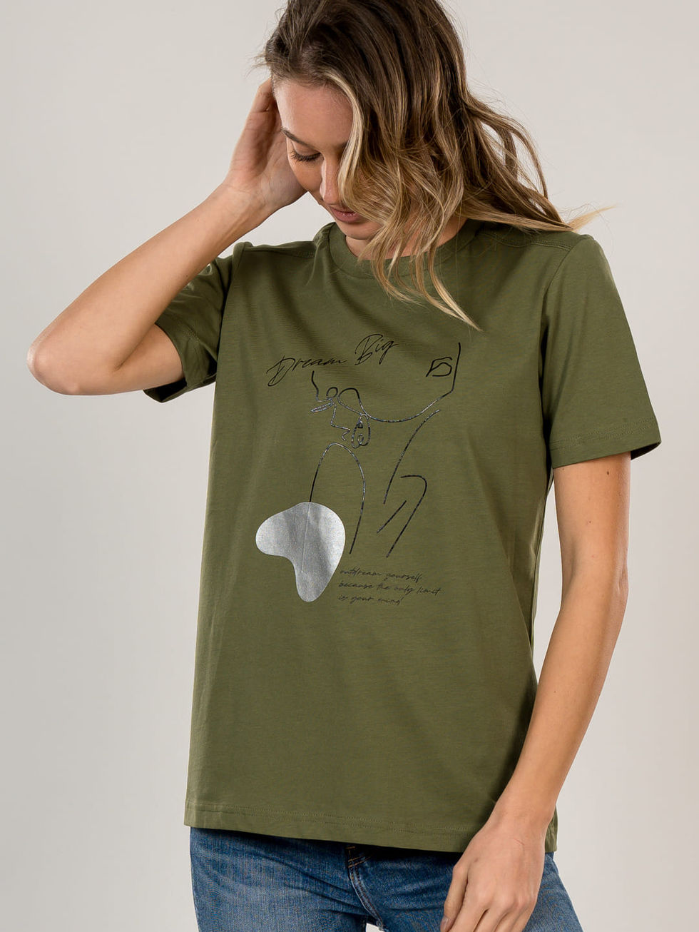 Za svaki dan kada ti treba podsetnik da sanjaš veliko – ova majica to radi umesto tebe. Apstraktna linijska ilustracija i diskretni metalik detalj daju joj umetnički pečat, dok natpis „Dream Big – motivate yourself because the only limit is your mind“ donosi dozu inspiracije.