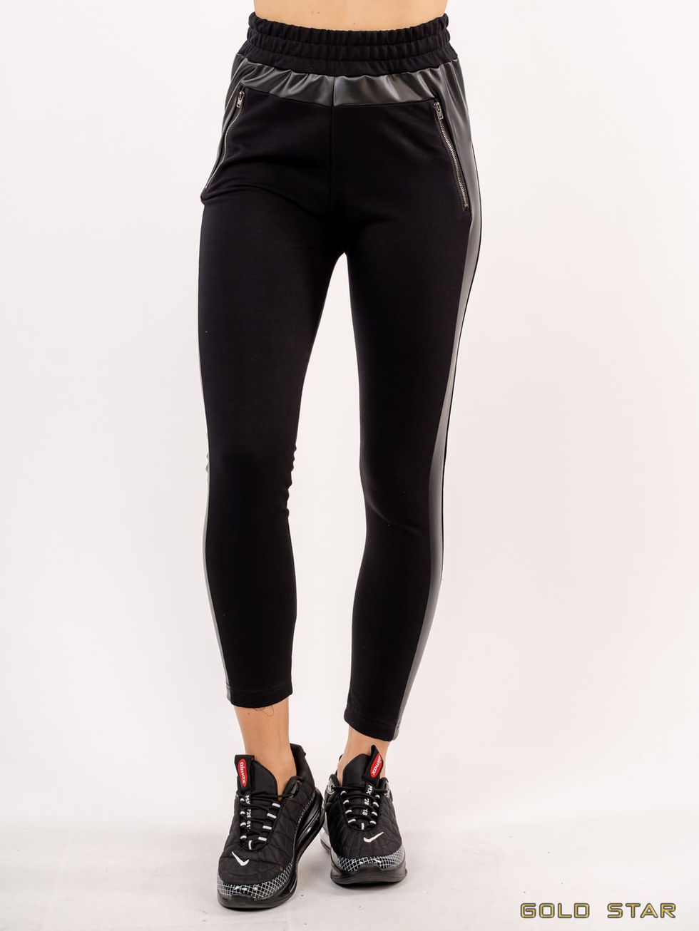 Helanke koje pomeraju granice svakodnevnog stila. Napravljene su od prijatnog, elastičnog materijala koji prati liniju tela, dok kožni detalji u gornjoj zoni i duž nogavica dodaju upečatljiv, urban karakter. Visoki struk sa širokom, prošivenom paspul trakom pruža dodatnu udobnost i sigurnost, a zatvarači na džepovima daju funkcionalan i trendi pečat.
