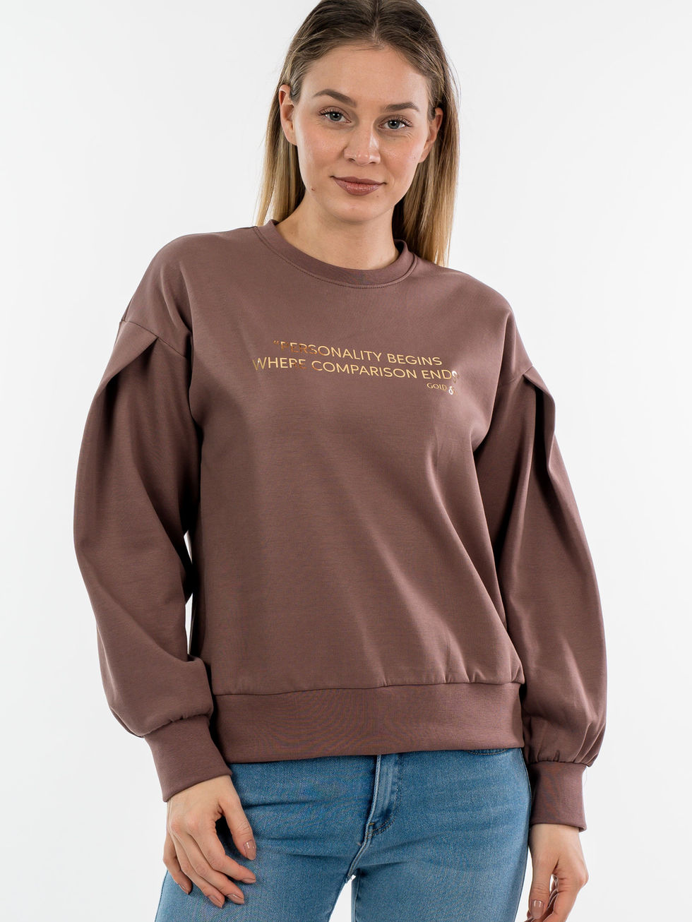 Duks dugih rukava u modernoj boji sa zlatnim printom „PERSONALITY BEGINS WHERE COMPARISON ENDS“ donosi spoj udobnosti i inspirativnog dizajna. Jedinstveni kroj sa blago naglašenim rukavima daje ženstvenu notu, dok kvalitetan materijal obezbeđuje prijatan osećaj tokom celog dana. Idealan za ležerne kombinacije uz farmerke ili trenerke, garderoba koja ističe samopouzdanje i originalnost.
